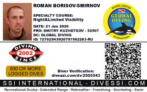 Если Вы обладаете сертификацией любого уровня, не меньше OWD, от SSI, то выберите в личном кабинете дайвцентр Global Diving /727025/, в качестве своего и сообщите инструкторам Global Diving свой ID и Фамилию-Имя, как они написаны на сертификате.