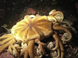 В умной книжке по зоологии беспозвоночных я прочитал что обитают такие звезды на больших глубинах от 70 метров. В прошлом году я увидел эту звезду в р-не мыса Картеш на глубине 20 метров.