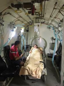 И тут кто-то из моих подбегает и говорит, что через знакомых в армии договорились, что меня примет военная барокамера. Бросаем все и на скорой едем туда.