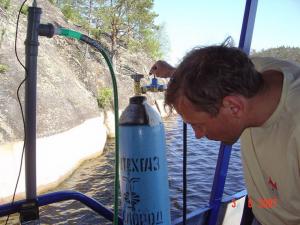 Сделали Тх 21/25. Всё это дело повесили на себя и нырнули для проверки полученных газов. Ныряли на о. Пуутсаари. Максимальная глубина 42 метра, общее время 35 минут. Для декомпрессии один дайвер использовал 40 найтрокс, второй чистый кислород (компрессор медленно бил баллоны и мешать еще один баллон с найтроксом не было времени). 2 дайверских организма на себе проверили качество смесей и пришли к выводу, что газы получились правильные и вкусные . Во время смешивания (главный газ миксер - Ярослав Гладышев) главное неудобство было из-за показаний % смеси. Цифирьки на мультиметре постоянно скакали. Пока непонятно с чем это связано ? На первый взгляд вижу 2 возможные причины: или неравномерно смешиваются газы в трубе и к датчику поступают с разным % содержанием О2, либо быстродействие датчика не соответствует скорости смешивания газов. Все полученные газы после забивки анализировали гелиево-кислородным анализатором ANALOX. Фотки выложу позже. Мешалку назвали МЯГ-1 (Максим, Ярослав, ГЕОфрог) Можно расшифровать и как МегаЯдерная Газосмесь  _________________ Ква ! |