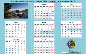 Актуальное расписание выходов катера РВК АТРИНА на 2016 год!!!