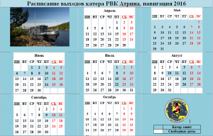 Актуальное расписание выходов катера РВК АТРИНА на 2016 год!!!
