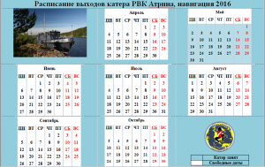 Актуальное расписание выходов катера РВК АТРИНА на 2016 год!!!
