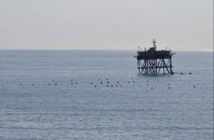 На фотографиях видны буйки устричной фермы по соседству с платформой и подвешенные на буях садки с устрицами: