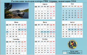Актуальное расписание выходов катера РВК АТРИНА на 2016 год!!!