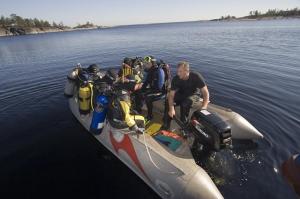 На борту для дайверов имеются компрессор, баллоны - 10л (алюминий), груза, поясные ремни.