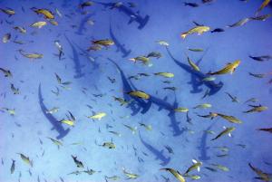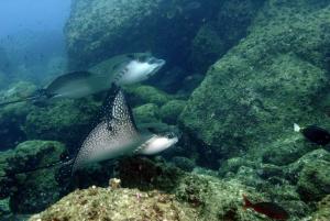 мы посетили сайт «SHARK BAY» где увидели стаи акул-молотов и галапагоских акул, мурены просто валялись между каменей, косяки барракуд. Очень не приятно сидеть в засаде, и в это время к тебе приходит холодное течение температура с 23 падает до 17 за считанные секунды. На сайте «LAND Slide» нас ждала встреча со скатами «игл- рэй», далее переход на знаменитую арку острова DARWIN.