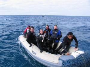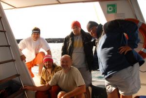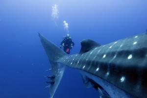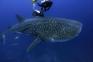 С утра нам обещали незабываемую встречу с китовой акулой, и, о Боже, мы свалились буквально на её хвост, да это не акула, а наверно «Подводная лодка», далее все последующие дайвы проходили только с китовыми акулами и всю мелочь типа акул-молотов мы не замечали. Довольно любопытный дайвинг у нас получался, находишься в засаде, а гиды высматривают «ЦЕЛЬ» и подают сигнал, группа отрывается от камней и как спринтеры догоняют китовую акулу, потом со всех сторон этой туши мелькают фотовспышки. День прошёл очень насыщено, все были под впечатлением увиденного, и завершился он посещением нашего судна местной чайкой, которая деловито обошла его и решила заночевать.