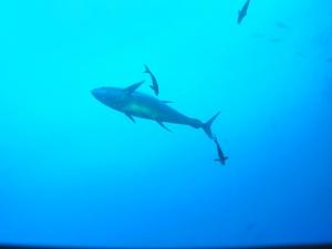 Следующие дневные дайвы уже проходили под девизом разнообразия. Увидеть тигровую, галапагосских серебристых. И как в хорошем ресторане, пожалуйста. Галапагосские ныряем сюда, тигровые в другое место. Вообще тигровых стали видеть почти на всех дайвах. Над было просто не вниз смотреть, а наверх.Всплывая на 5 ти метровую остановку чтобы отстоять положенное время. Совсем рядом прошла большая тигровая. Не просто большая, а очень. И это не у страха глаза велики. Страх к акулам потеряли уже после первых дайвов. Спокойная своими грозными размерами и леденящей грациозностью она проплыла, даже не обратив на нас внимание. Обидно как то. Мы так далеко ехали, летели, а она!!! Но у неё свои дела насущные, добывала пищу. Проплывая на небольшой глубине вдоль берега, высматривала молоденьких птенцов чаек, периодически падавших в воду и закусывала молоденькими хрустящими цыплятами. Хруста, я честно не слышал, но представилось очень ярко. На третий день этого сумашедствия, наконец то начали замечать других рыбок: мурен, скатов орляков, окуней и всякую другую мелочь. Нашли даже рыбу камень, стоун фиш, и фрог фиш - рыбу лягушку. Ракушки разные. Особенно поразило большое количество лобстеров. Так и хотелось зажевать несколько. Но, нельзя, всё охраняется! Акулам надо тоже чем то питаться. Особенно понравились какие то новые пятнистые рыбки , которые нагло сновали совсем рядом от нас, не возражая когда их гладили и даже настаивая на этом. Меня же больше всего достали огромные желтопёрые тунцы, которые поодиночке периодически проплывали над нами. Причём, норовили проплыть поближе ко мне. Знали видимо, что я сегодня дайвер и здесь без ружья- издевались!!!! Увидели воочию охоту дельфина под водой. Здоровенный дельфин носился за небольшим джеком прямо перед нашим наблюдательным пунктом, джек оказался хитрее и дельфин остался с носом.