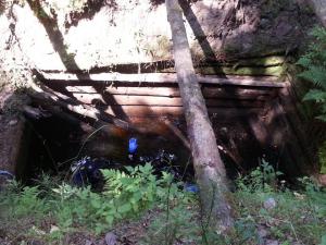 Гребнеобразный отвал начинается в 15 м к юго-западу от «восточного» ствола шахты. Он вытянут в юго-восточном направлении почти на 50 м, при ширине 6-10 м и высоте 2.2-2.8 м. Поверхность отвала также заросла молодыми деревьями, в окружении высоких елей и сосен. Вдоль внешнего борта отвала, обращенного к дороге, на 25 м тянется прогнившая бревенчатая подпорная стенка высотой 1-1.3 м, от которой внутрь насыпи отходят бревенчатые перегородки, образующие клети-секции сечением 3 х 6 м2 . Когда – то это действительно были секции, в которые ссыпалась отвальная порода, но затем они оказались переполнены и засыпаны. В одном месте два нижних венца подпорной стенки поддерживались глубоко вбитым в землю горняцким зубилом. Этот предмет был взят и передан автором в 2000 году в Питкярантский краеведческий музей, в котором также хранится плотницкое сверло, найденное тут же, у подпорной стенки.