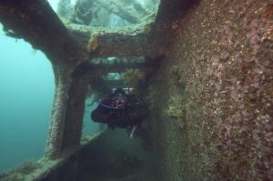 В порту было затоплено 34 судна, принадлежащих Норвегии, Британии, Франции, Нидерландам и Германии. Часть этих судов доступна для дайвинга, часть нет. Отсутствие разрешения на дайвинг связано с тем, что некоторые суда признаны воинскими захоронениями, а часть не разоружена и может представлять опасность. С доступных кораблей сняты винты и вооружение. Степень доступности рэков хорошая. Глубины, на которых они находятся в гавани, не превышают 30 метров. Часть затопленных судов после войны оттащили от фарватера. Там тоже глубина где-то метров 25-28 по грунту. Транспортные суда большие – более 120 -140 м в длину. Сохранились остатки надстроек, открыты трюмы. Есть возможность проникнуть во внутренние помещения. На затопленных эсминцах через дыры в борту виден санфаянс. Цель нашей поездки не состояла в детальном обследовании каждого рэка, а скорее предполагала формирование общего образа. Образ, получившийся у меня таков: рэки очень красивые, прекрасно сохранившиеся. Порадовало то, что там достаточно естественного света. Прозрачность воды меняется в зависимости от прилива-отлива. В лучшие дни, со слов местных, прозрачность составляет до 60 метров. Акватория порта не замерзает. Нырять можно круглый год. Зимой температура воды составляет 3 градуса, летом 7-9. Рэки являются естественным убежищем для рыб. Возле каждого корабля пасутся стаи трески. Поглубже, в убежищах, находятся рыбы покрупнее. Насчет подводной охоты я не спросил, каюсь. Много крупных двустворчатых моллюсков. Может это мидиолусы, может какой-то их близкий родственник. Внутренние поверхности некоторых трюмов чистые. Там, где трюм сообщается с морем через пробоину в борту на стенах и потолке бурно растут актинии и мягкие кораллы. Камчатский краб есть, но маленький. Норвеги называют его тролль-краб. Удачное название, кстати. Сложность в погружениях составляют приливно-отливные течения. Перепад до 2,5 метров. Течение сильнее чувствуется у поверхности. Бот, на котором выходили в море швартовался к буйку, которым отмечен тот или иной рэк. Брифинг минимальный.