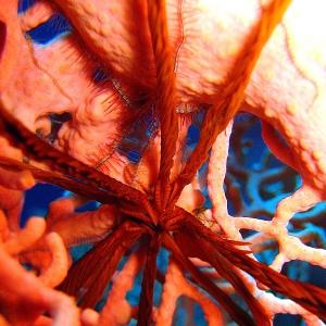 Десятилучевая лилия и офиура на сетке горгонарии.