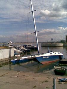 Доступ к пробоинам только изнутри. Саму яхту мотает на волне. Разбивает днище. Корпус-фанера 8мм покрытая стекловолокном. До грунта 1,5-1,8 метра. Даже понтоны фиг заведешь.