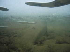 Были опасения, что лёд ещё не крепкий, ведь на воздухе держится плюсовая температура, но лёд оказался толщиной 10-15 см, что позволило сделать майну подальше от берега. Под майной была глубина 6-7 метров и глубина погружений доходила до 14 метров.