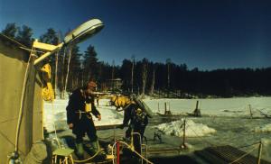 Вильям Борисович Муравьёв в 1985 г во время обеспечения подводных исследований у будки надводного обеспечения, установленной на льду над подводным домом «Спрут»