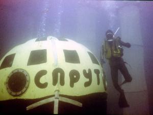 подводный дом "Спрут" на исследовательском полигоне марикультуры. На заднем плане просматриваются садки-вольеры для рыб (Черное море, Большой Утриш, 1985-86)