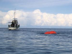Буксировка 6-тонного якорного блока на понтонах парашютного типа к месту установки погружных рыбоводных садков системы SADCO на озере Иссык-Куль