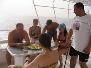 Питание, как и всегда было на высоте. Питались отчасти свежей рыбкой. Пару раз делали суши из тунца. Суши не с ноготь размером, а нормальное суши – сразу целый поднос только одной рыбы)). В промежутки между завтраком, обедом и ужином к местам заседания участников сафари, команда очень кстати доставляла подносики с фруктами (арбуз, дыня, манго, персики и т.п.). По вечерам, глядя на звезды, пропускали по стаканчику вискаря или холодненького пивка, что внушало оптимизм в завтрашний день))