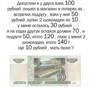Приходит бедный домой, садится за стол и рассуждает: Ничего не понимаю! Денег нет, топора нет, осенью должен рубль отдать и при этом всё верно....