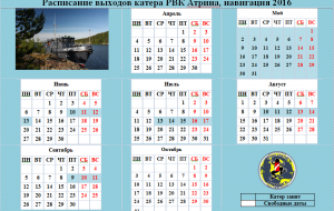 Актуальное расписание выходов катера РВК АТРИНА на 2016 год!!!