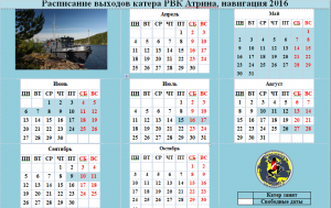 Актуальное расписание выходов катера РВК АТРИНА на 2016 год!!!