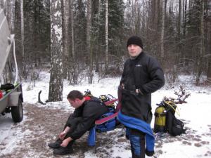 Приехав на карьер и увидев, что поверхность покрыта льдом, мы поначалу расстроились. Но выяснилось, что "слой льда" является тонкой, только схватившейся корочкой, ломающейся при малейшем усилии и даже без оного. Дайверы тут же воспряли духом (особенно Алексей, который нырять и не собирался) и программа выходных была выполнена полностью!