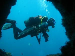 В несколько мы залезли. Запомнилась 20-30 метровая пещера с воздушным мешком в конце, всплыли, поговорили, сфотографировались и пошли взад. Рядом 110 метровый проход на другую сторону острова, прошли и его. Выход виден не сразу, поэтому без фонарика достаточно жутковато плыть. Через одного поставили пловцов с фонариками и поплыли. Множество небольших проходов и гротов.