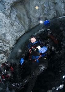 Гоша уже уехал в командировку, поэтому отвечу я. Последняя фотография сделана с дайвером, лежащим в майне. Лёд был оч.толстый и майну мы сверлили ледорубом, поэтому её размер мы сделали небольшой прим. 80*150, убрали снег и лёд помыли водой, отсюда такая освещённость. Майну делали вплотную к стенке, то есть практически над аркой. Видимость и ориентиры позволили нам отказаться от ходовиков. Я же со страховочным концом только потому, что после фотографирования мы запланировано сходили к сл. арке для прикидки сл. фотосессии. Человека из Гимса накануне информировали по телефону и на всякий случай отправили факс администрации карьера. Проблем не было никаких. |